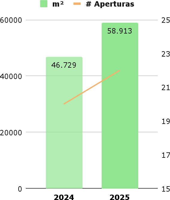 Cabe señalar que 2024 ya fue un año especialmente activo, con 20 nuevas aperturas sumando 46.729 m² al mercado.