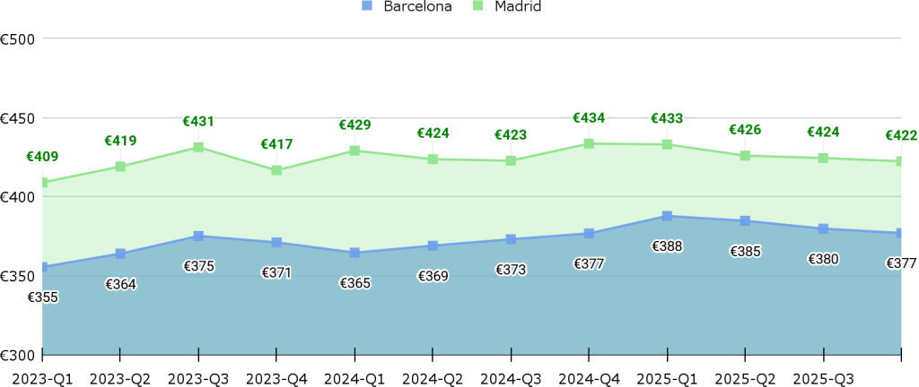 Aun así, se mantiene una brecha estructural entre ambas ciudades, con Madrid situándose de media un 16 % por encima de Barcelona en los últimos trimestres analizados